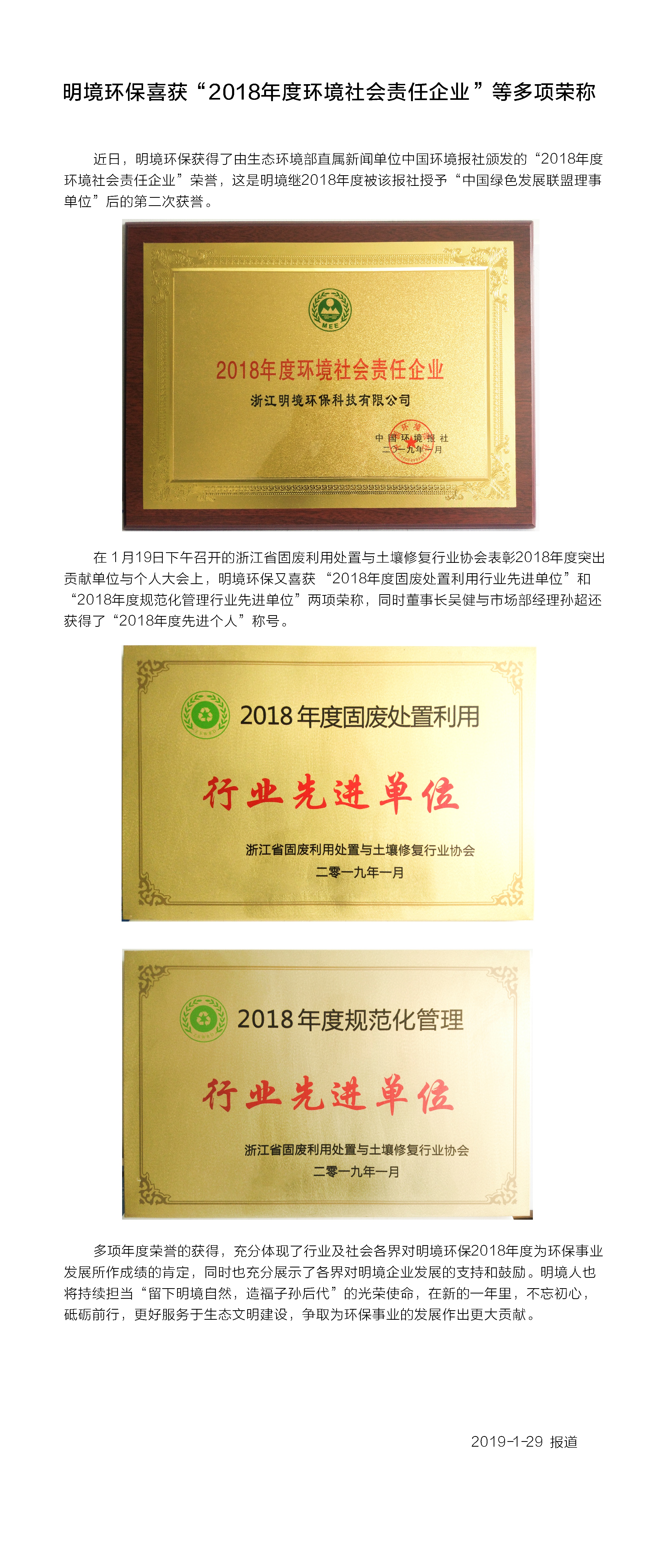 明境環保喜獲“2018年度環境社會責任企業”等多項榮稱