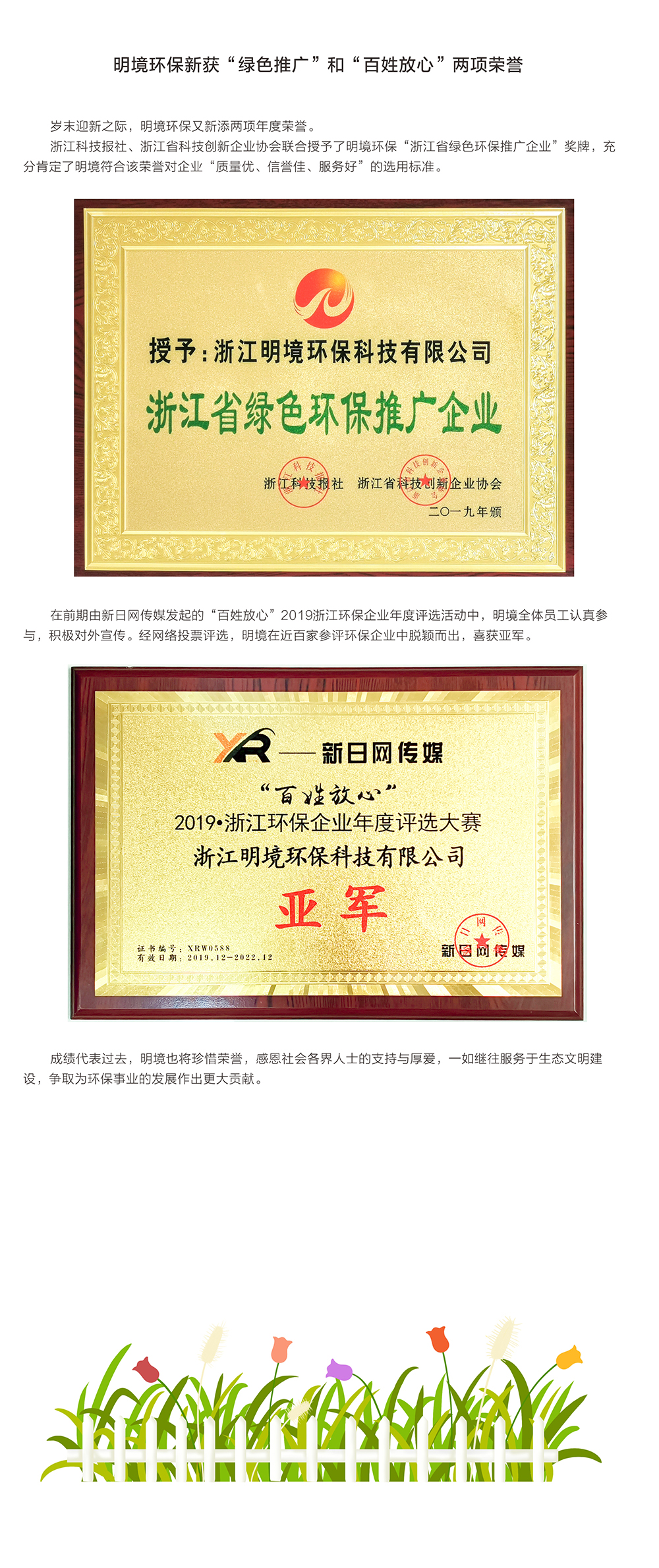 明境環保新獲“綠色推廣”和“百姓放心”兩項榮譽